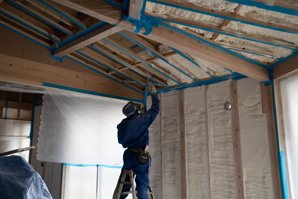 断熱材の吹付が終わり職人さんが天井ボードの施工が始まっておりました!