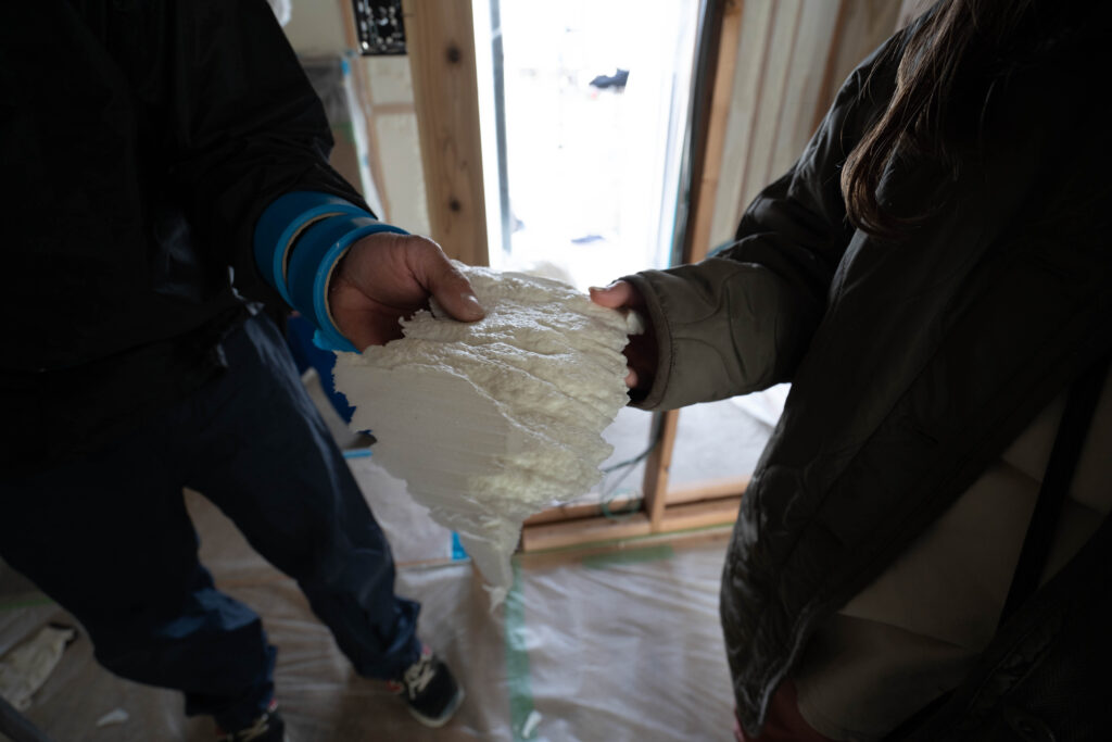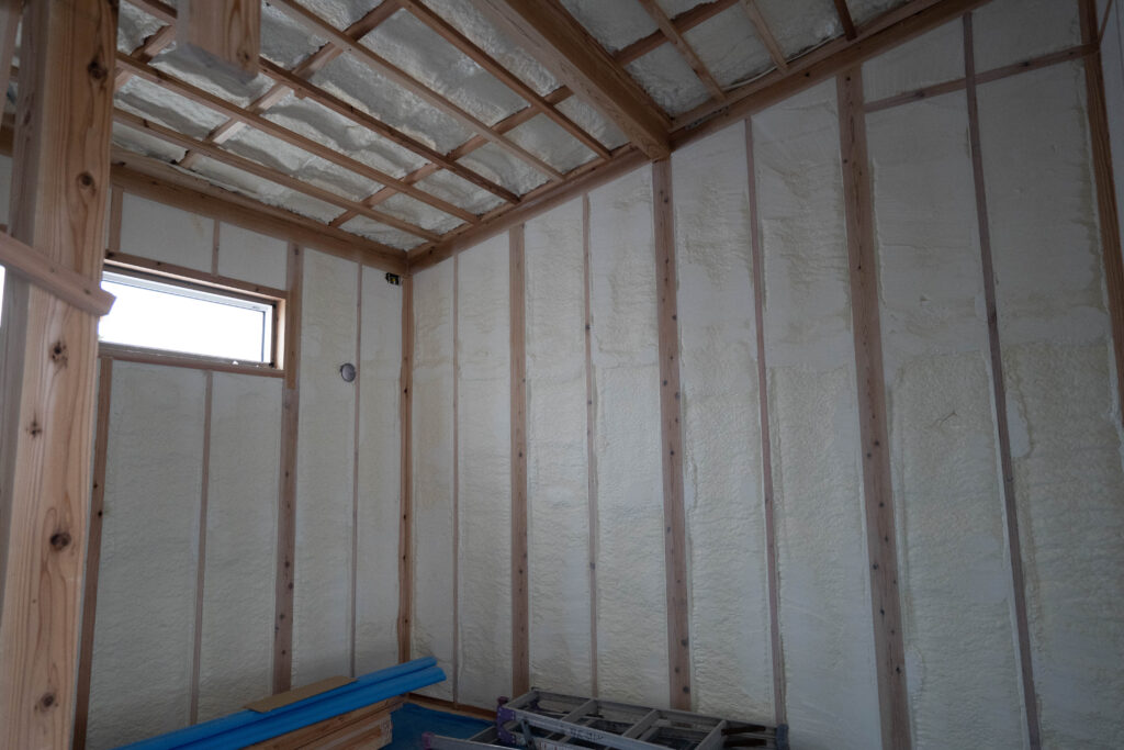 今日がタイミングよく断熱材の吹付で実際に見ることができました!