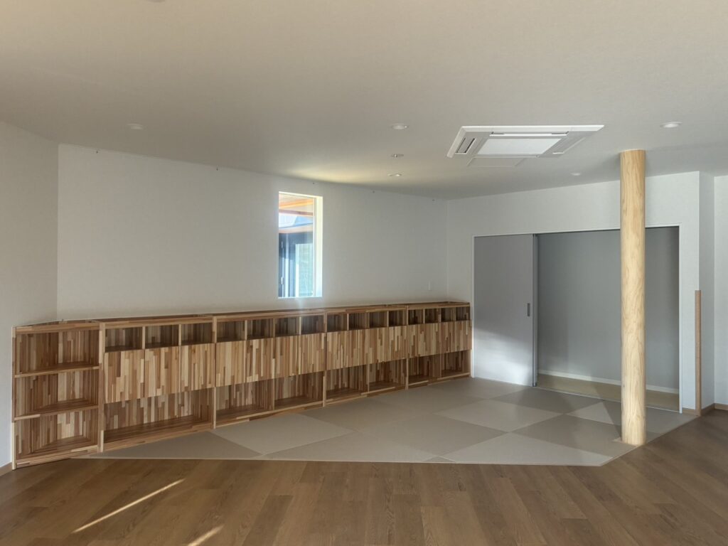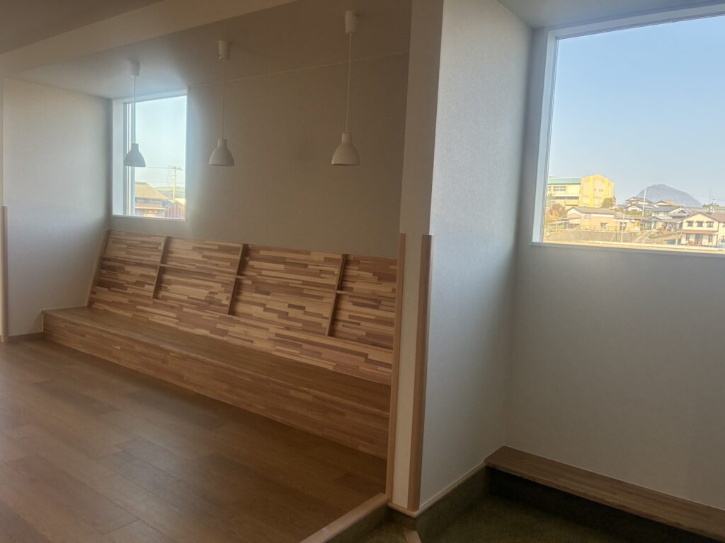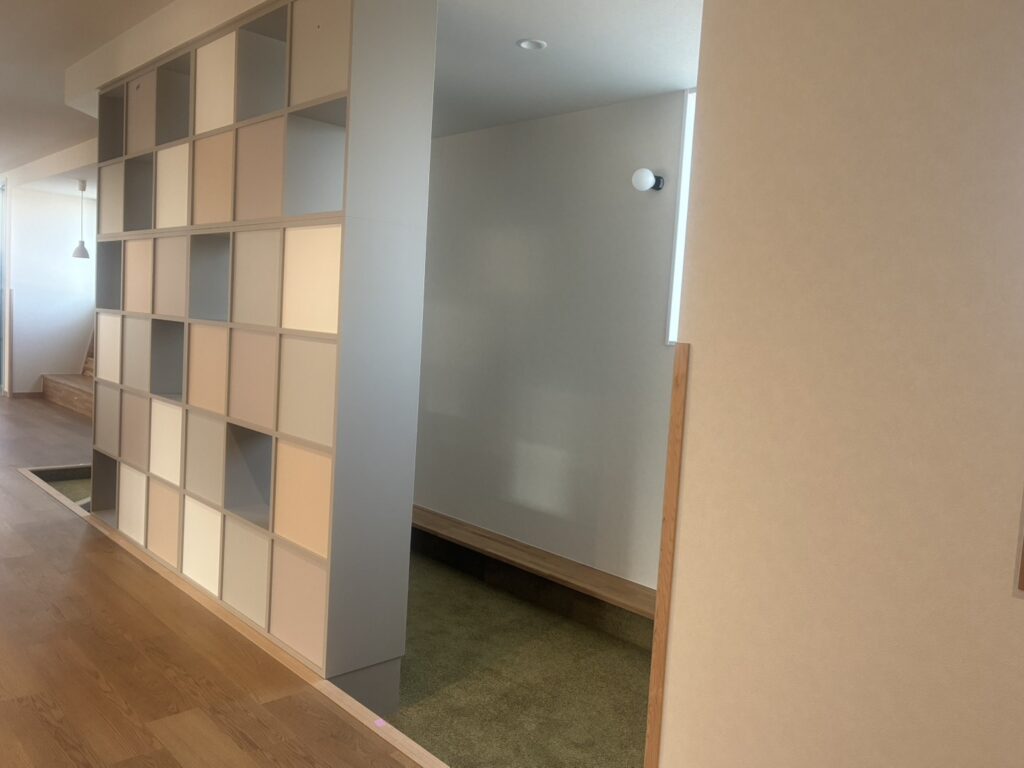 こちらは廊下にある、こもりコーナーと絵本を置けるコーナーになります^^